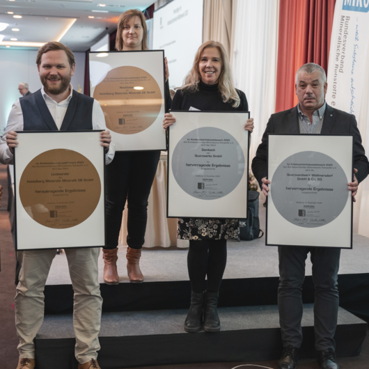 Beim Arbeitssicherheitswettbewerb des Verbands Mineralische Rohstoffe (MIRO) wurde das Quarzsandwerk Wellmersdorf im Jahr 2023 mit der Bronze-Urkunde für besondere Ergebnisse ausgezeichnet. Von 110 teilnehmenden Werken aus dem Sand- und Kiesbereich erhielten nur sechs eine Auszeichnung. Damit wird ein besonders positives Verhältnis zwischen der Anzahl der im Werk geleisteten Arbeitsstunden sowie den eingetretenen Arbeitsunfällen gewürdigt. Wir freuen uns sehr über die Auszeichnung und sehen sie als Ansporn, Arbeitssicherheitsmaßnahmen in unserem Werk weiterhin kontinuierlich voranzutreiben.