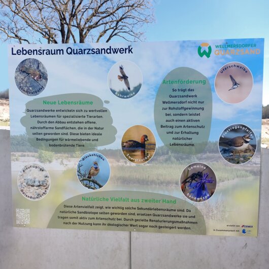 Gemeinsam mit dem Landesbund für Vogel- und Naturschutz in Bayern e.V. (LBV) hat das Quarzsandwerk Wellmersdorf eine neue Infotafel am Radweg installiert. Der Weg führt direkt am Gewinnungsfeld vorbei und bietet Besucherinnen und Besuchern nun spannende Einblicke in den besonderen Lebensraum innerhalb des Werksgeländes.